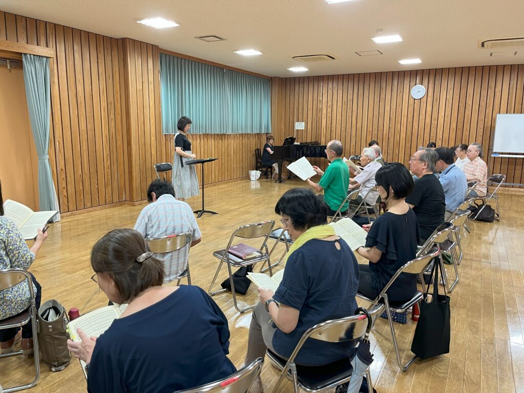 「今回の練習はエアコンの故障のなか、しかも特別に暑い午後で皆さんの体調を心配しましたが、いらした方々はエネルギッシュに熱心に練習に参加できました。今回は前回に音取りした部分の復習を中心にしました。そして、指揮者の守廣先生からのレッスンで、音楽の作りについて学ぶことができました。
